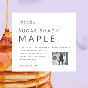 Like a sweet, crisp day & fresh pancakes on Sunday morning! The Sugar Shack Maple soy candle will provide a cozy and inviting spring scent in your home this season. Brimming with our communal Canadian memories of hot, fresh maple syrup poured onto fresh snow, this locally inspired scent will burn 100% clean and provide a beautiful, all-natural glow.